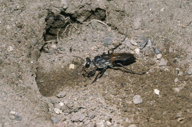 巣穴を堀るクロアナバチ 前脚と口で土を抱えて運び出す の写真素材 イラスト素材 アマナイメージズ